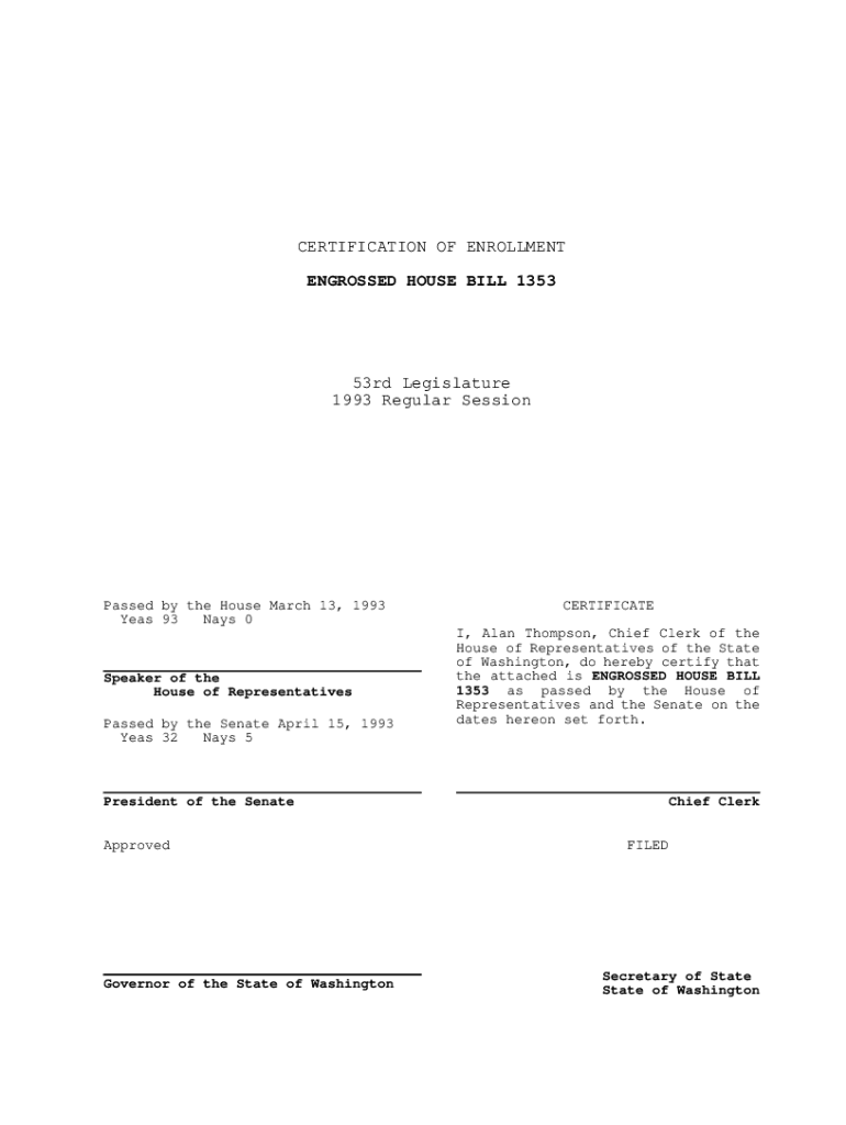 CERTIFICATION OF ENROLLMENT ENGROSSED HOUSE BILL 135353rd Legislature 1993 Regular SessionPassed by the House March 13, 1993 Yeas 93 Nays 0Speaker of the House of Representatives Passed by the Senate