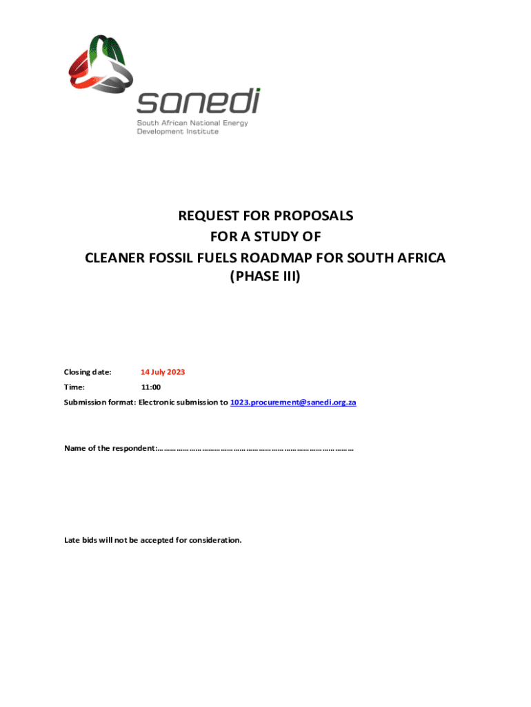 REQUEST FOR PROPOSALS FOR A STUDY OF CLEANER FOSSIL FUELS ROADMAP FOR SOUTH AFRICA (PHASE III)Closing date:14 July 2023Time:11:00Submission format: Electronic submission to 1023.procurement@sanedi.org.zaName
