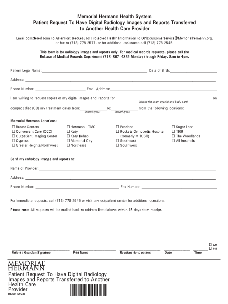 Memorial Hermann Health System Patient Request To Have Digital Radiology Images and Reports Transferred to Another Health Care Provider Email completed form to Attention: Request for Protected Health