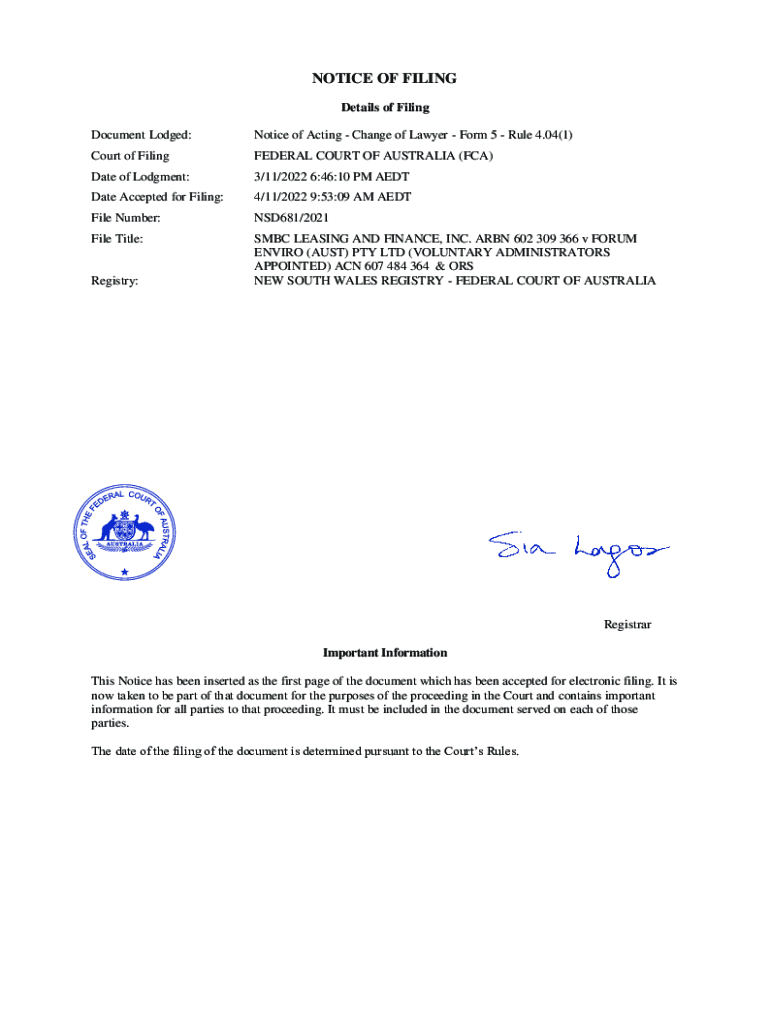 NOTICE OF FILING Details of Filing Document Lodged:Notice of Acting Change of Lawyer Form 5 Rule 4.04(1)Court of FilingFEDERAL COURT OF AUSTRALIA (FCA)Date of Judgment:3/11/2022 6:46:10 PM Candidate