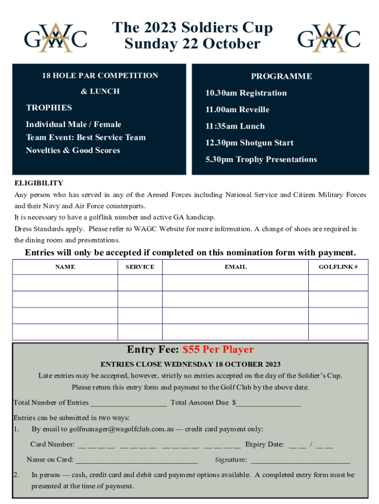 & LUNCH10.30am RegistrationTROPHIES11.00am ReveilleIndividual Male / Female11:35am Luncheon Event: Best Service TeamNovelties