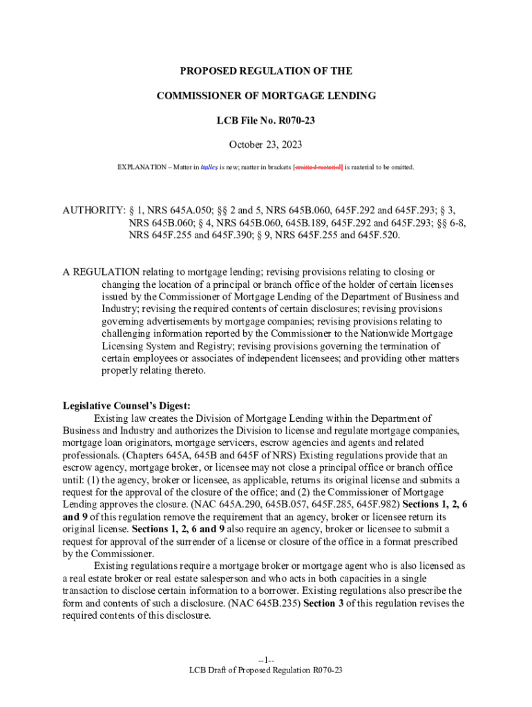 PROPOSED REGULATION OF THE COMMISSIONER OF MORTGAGE LENDING LAB File No. R07023 October 23, 2023, EXPLANATION Matter in italics is new; matter in brackets [omitted material] is material to be omitted.AUTHORITY: