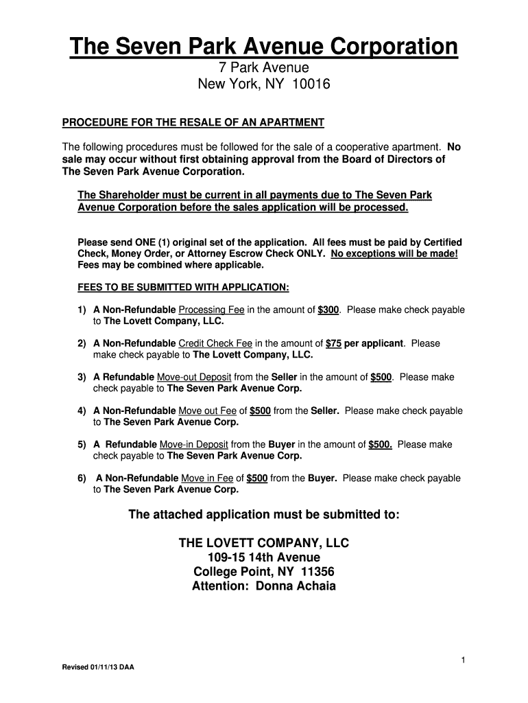 This document outlines the procedures, fees, and application requirements for the resale of a cooperative apartment managed by The Seven Park Avenue Corporation, including necessary approvals, financial