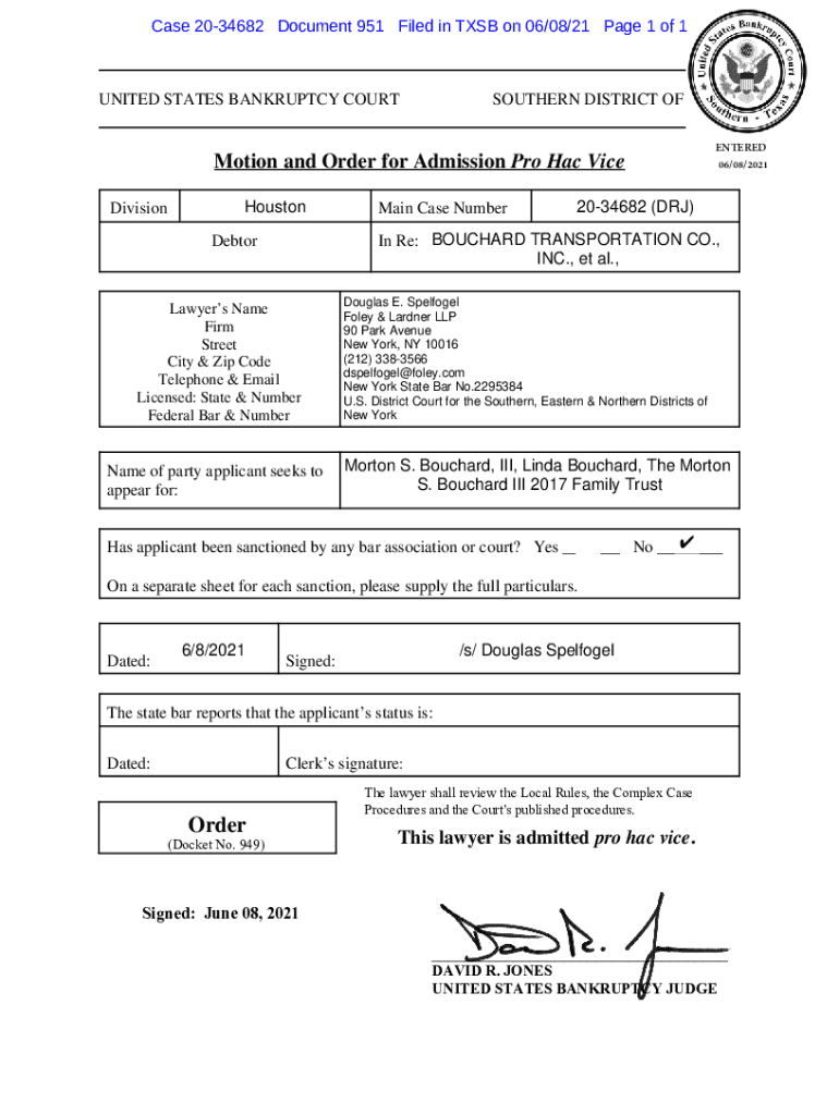 Case 2034682 Document 951 Filed in TSB on 06/08/21-Page 1 of 1UNITED STATES BANKRUPTCY COURTSOUTHERN DISTRICT OF TEXASMotion and Order for Admission Pro HAC Vice