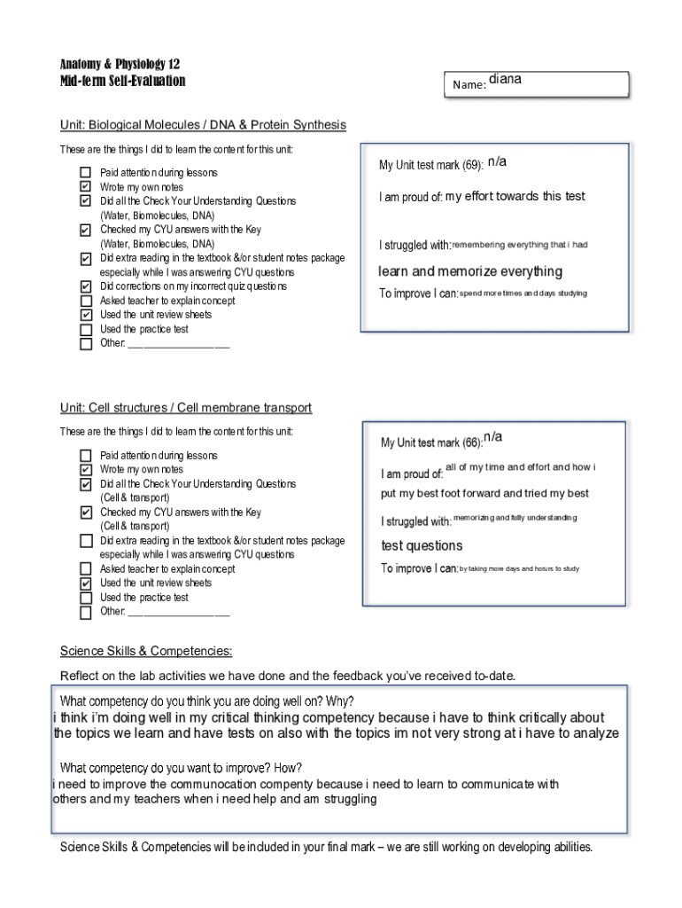 Anatomy & Physiology 12Midterm SelfEvaluationName: dianaUnit: Biological Molecules / DNA & Protein Synthesis These are the things I did to learn the content for this unit: Paid attention during lessons