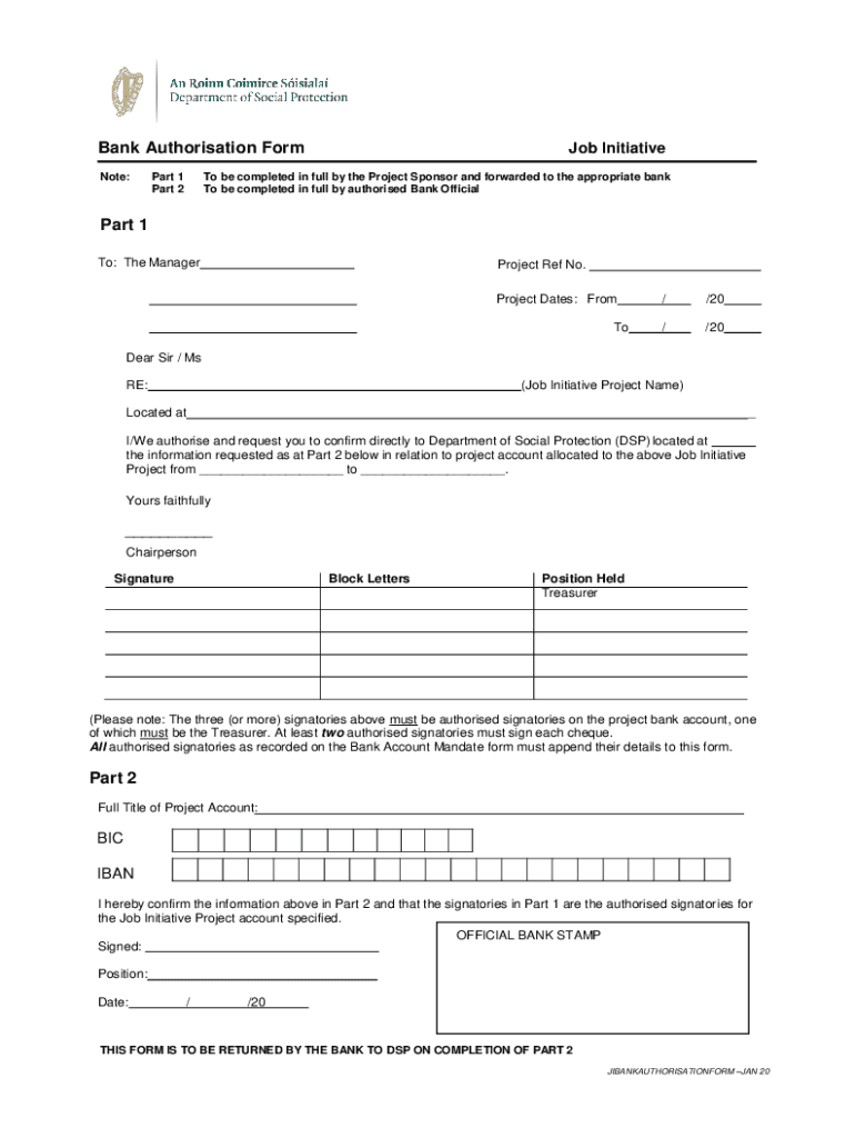 Bank Authorization Form Note:Part 1 Part 2Job Initiative be completed in full by the Project Sponsor and forwarded to the appropriate bank To be completed in full by authorized Bank OfficialPart 1