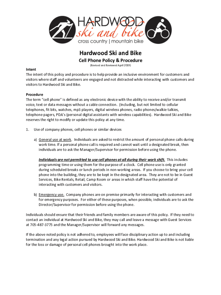 Hardwood Ski and Bike Cell Phone Policy & Procedure (Revised and Reviewed April 2019)Intent The intent of this policy and procedure is to help provide an inclusive environment for customers and visitors
