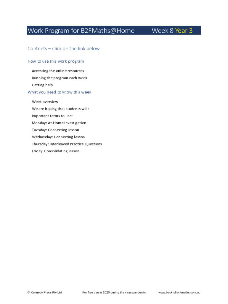 Work Program for B2FMaths@HomeWeek 8 Year 3Contents click on the link below
