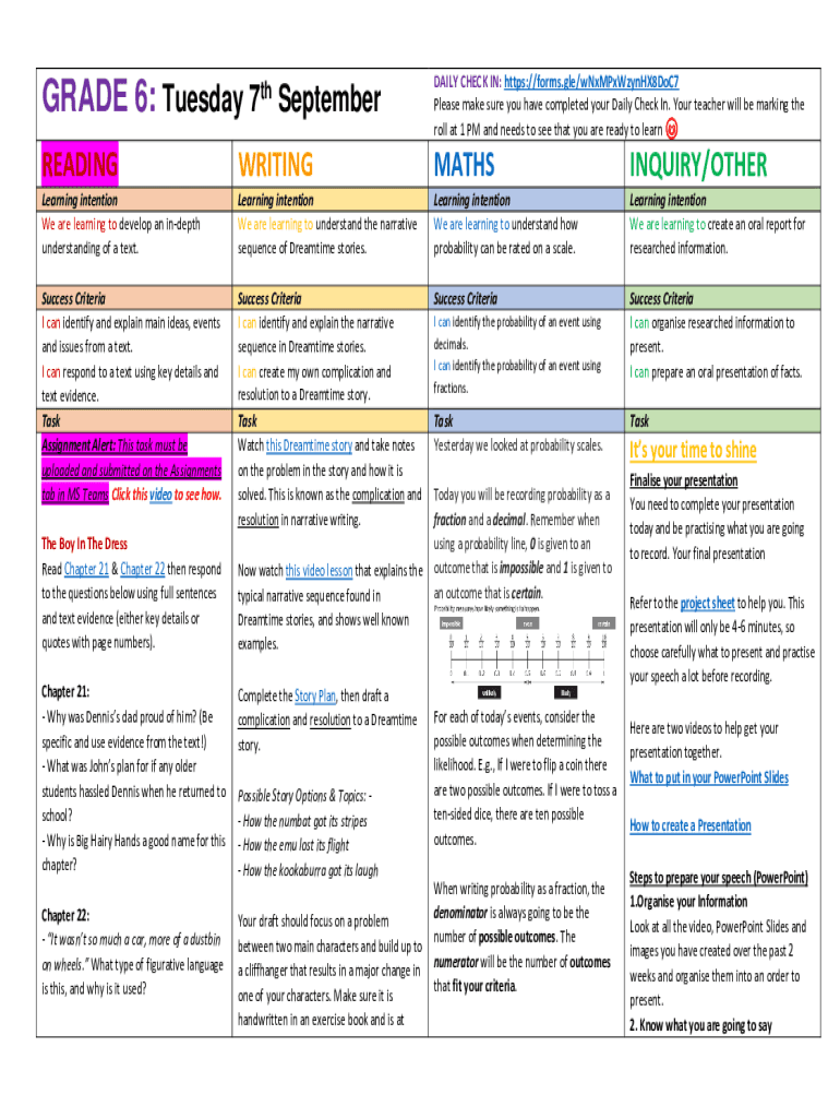 GRADE 6: Tuesday 7th SeptemberDAILY CHECK IN: https://forms.gle/wNxMPxWzynHX8DoC7 Please make sure you have completed your Daily Check In. Your teacher will be marking the roll at 1 PM and needs to