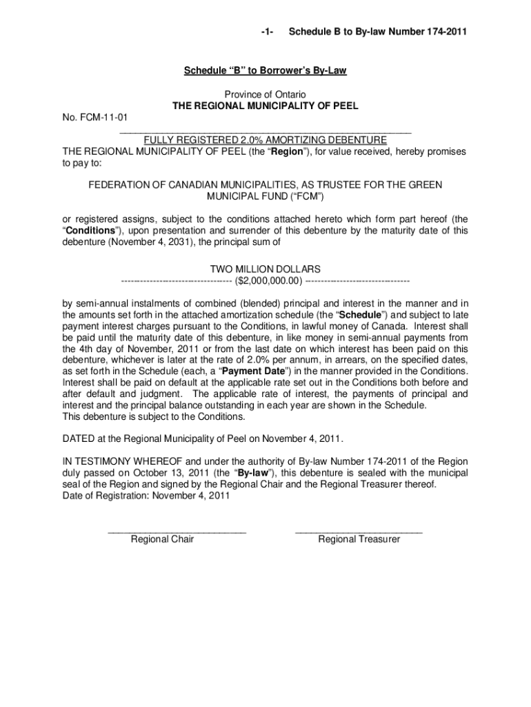 1Schedule B to Bylaw Number 1742011Schedule B to Borrowers Bylaw Province of Ontario THE REGIONAL MUNICIPALITY OF PEEL No. FCM1101 ___ FULLY REGISTERED 2.0% AMORTIZING DEBENTURE THE REGIONAL MUNICIPALITY