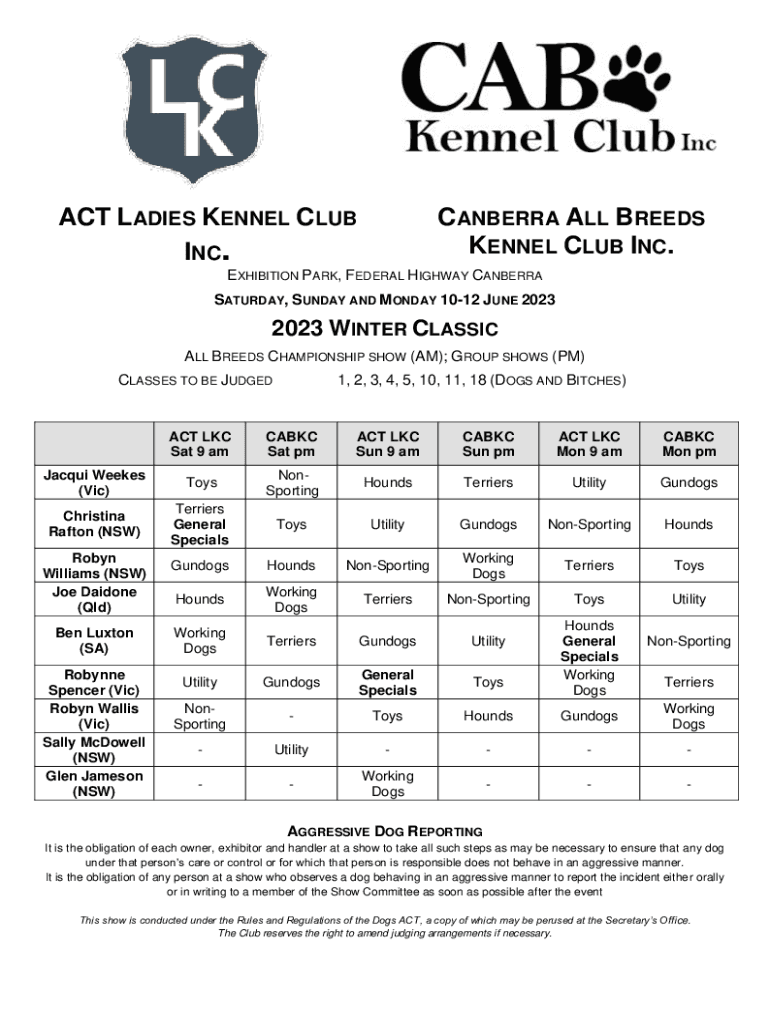 ACT LADIES KENNEL CLUB INC.CANBERRA ALL BREEDS KENNEL CLUB INC.EXHIBITION PARK, FEDERAL HIGHWAY CANBERRA SATURDAY, SUNDAY AND MONDAY 1012 JUNE 20232023 WINTER CLASSIC ALL BREEDS CHAMPIONSHIP SHOW