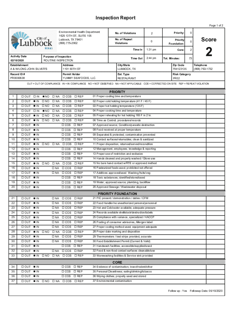 Inspection Report Page 1 of 2 Environmental Health Department 1625 13TH ST, SUITE 105 Lubbock, TX 79401 (806) 7752902Activity Date 02/10/2020No. of Violations2Priority:0No. of Repeat Violations0Priority