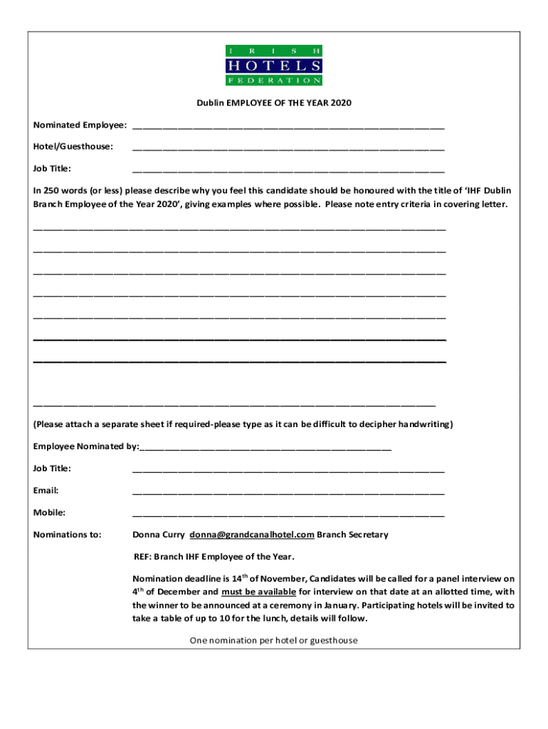 Dublin EMPLOYEE OF THE YEAR 2020 Nominated Employee: ___ Hotel/Guesthouse:___Job Title:___In 250 words (or less) please describe why you feel this candidate should be honoured with the title of IHF