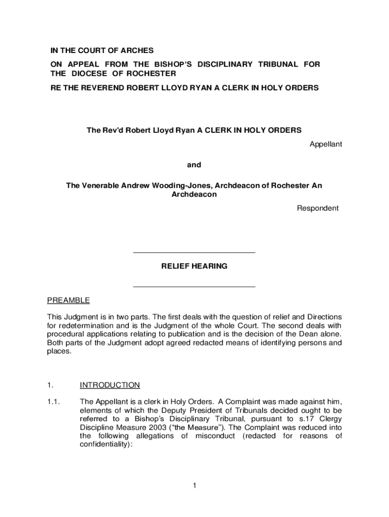 IN THE COURT OF ARCHES ON APPEAL FROM THE BISHOPS DISCIPLINARY TRIBUNAL FOR THE DIOCESE OF ROCHESTER RE THE REVEREND ROBERT LLOYD RYAN A CLERK IN HOLY Orders Rev\'d Robert Lloyd Ryan A CLERK IN HOLY