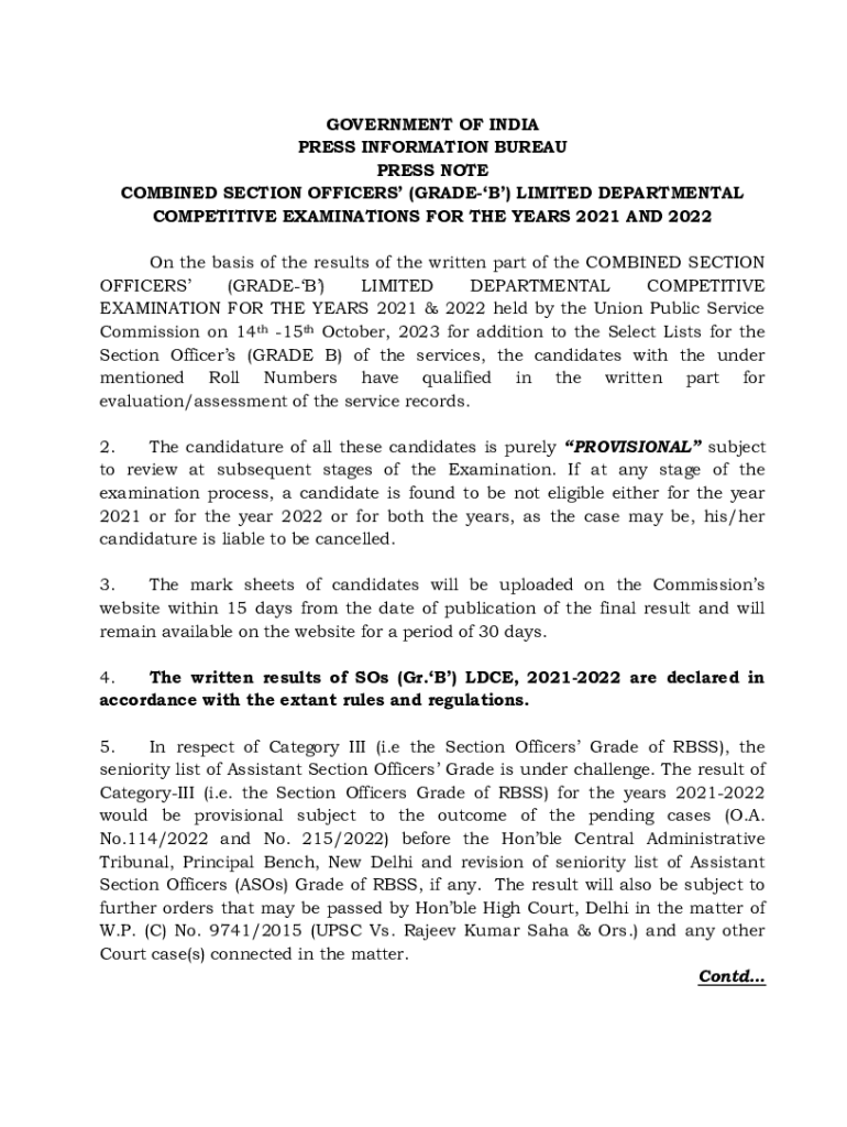 GOVERNMENT OF INDIA PRESS INFORMATION BUREAU PRESS NOTE COMBINED SECTION OFFICERS (GRADE) LIMITED DEPARTMENTAL COMPETITIVE EXAMINATIONS FOR THE YEARS 2021 AND 2022 On the basis of the results of the