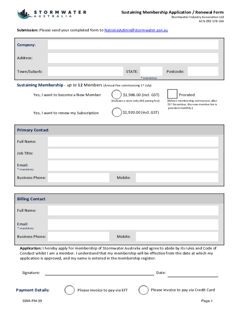 Sustaining Membership Application / Renewal Form Stormwater Industry Association Ltd ACN 093 578 164Submission: Please send your completed form to NationalAdmin@stormwater.asn.auCompany: Address: