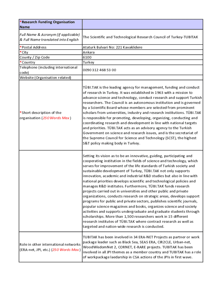 *Research Funding Organisation Name Full Name & Acronym (if applicable) The Scientific and Technological Research Council of TurkeyTUBITAK & Full Name translated into English *Postal Address *City