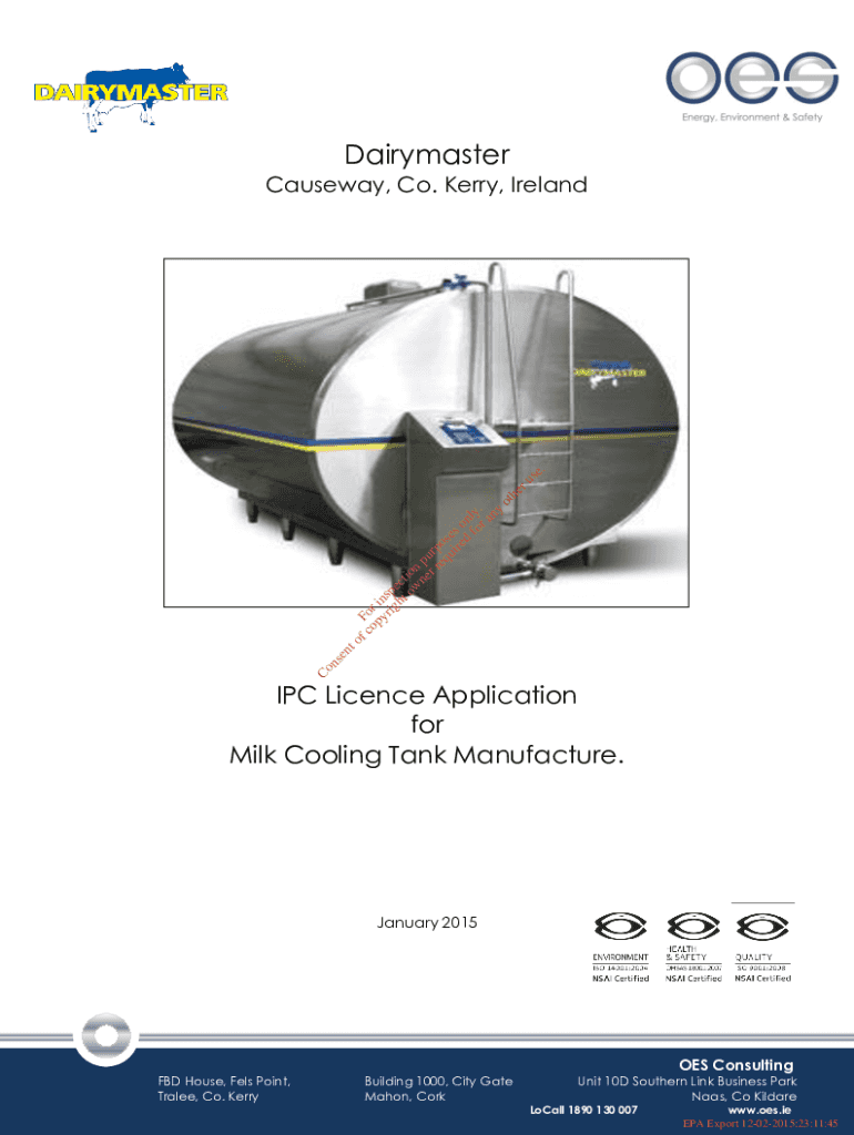 DairymasterCons ento f c Fo op r i yr ns ig pe ht ct ow ion ne pu r r rp eq os ui es re o d nl fo y. ra nyotheruse.Causeway, Co. Kerry, IrelandIPC Licence Application for Milk Cooling Tank Manufacture.January