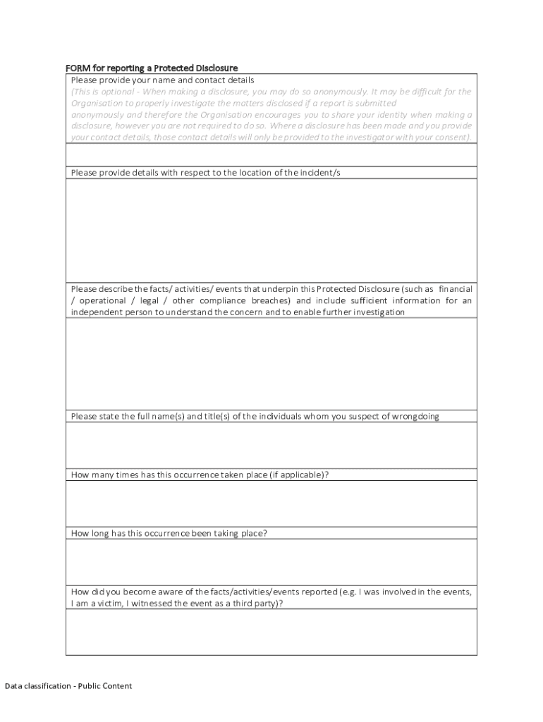 FORM for reporting a Protected Disclosure Please provide your name and contact details (This is optional When making a disclosure, you may do so anonymously. It may be difficult for the Organization
