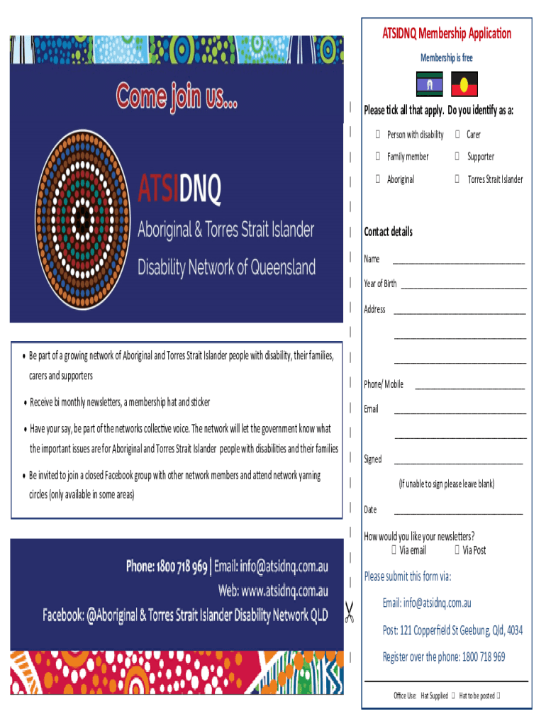 ATSIDNQ Membership Application Membership is free|Please tick all that apply. Do you identify as a:|Person with disabilityCarer|Family memberSupporter|AboriginalTorres Strait Islander| Be part of