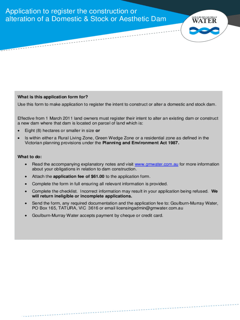 Application to register the construction or alteration of a Domestic & Stock or Aesthetic DamWhat is this application form for? Use this form to make application to register the intent to construct