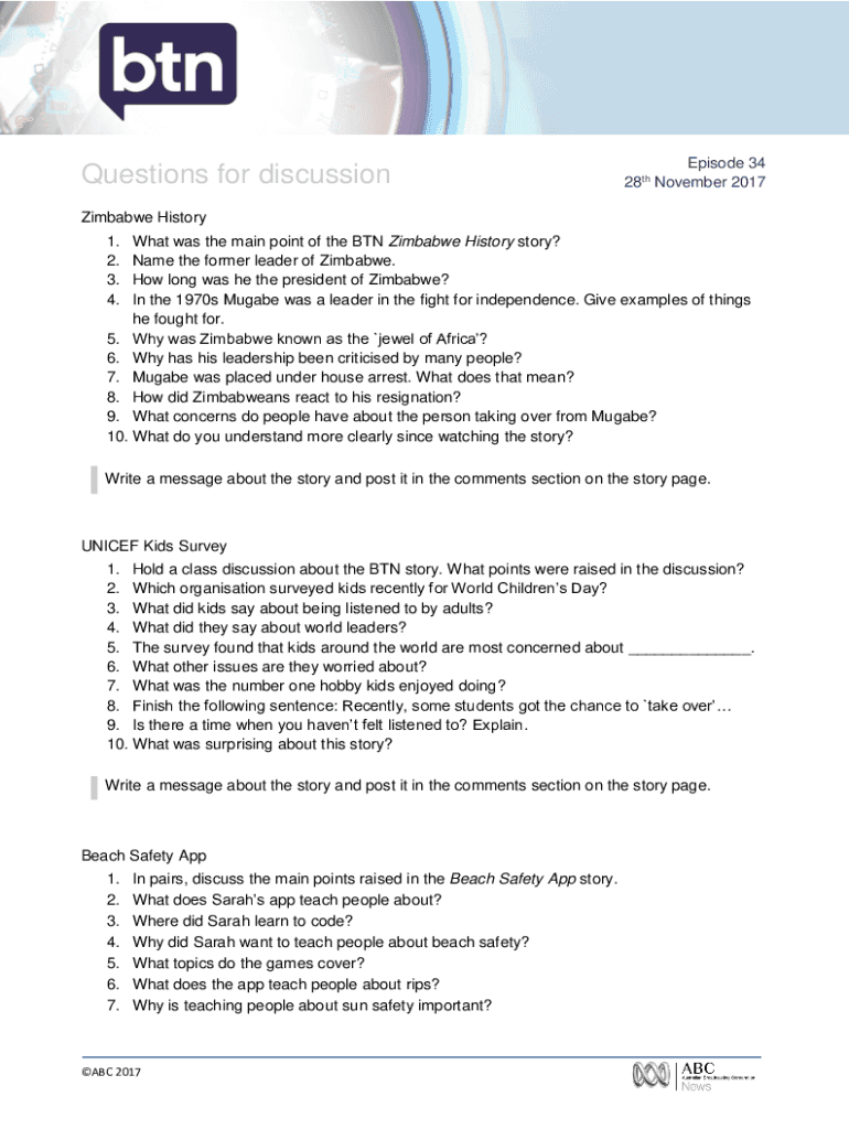 Questions for discussionEpisode 34 28th November 2017Zimbabwe History 1. 2. 3. 4. What was the main point of the BTN Zimbabwe History story? Name the former leader of Zimbabwe. How long was he the
