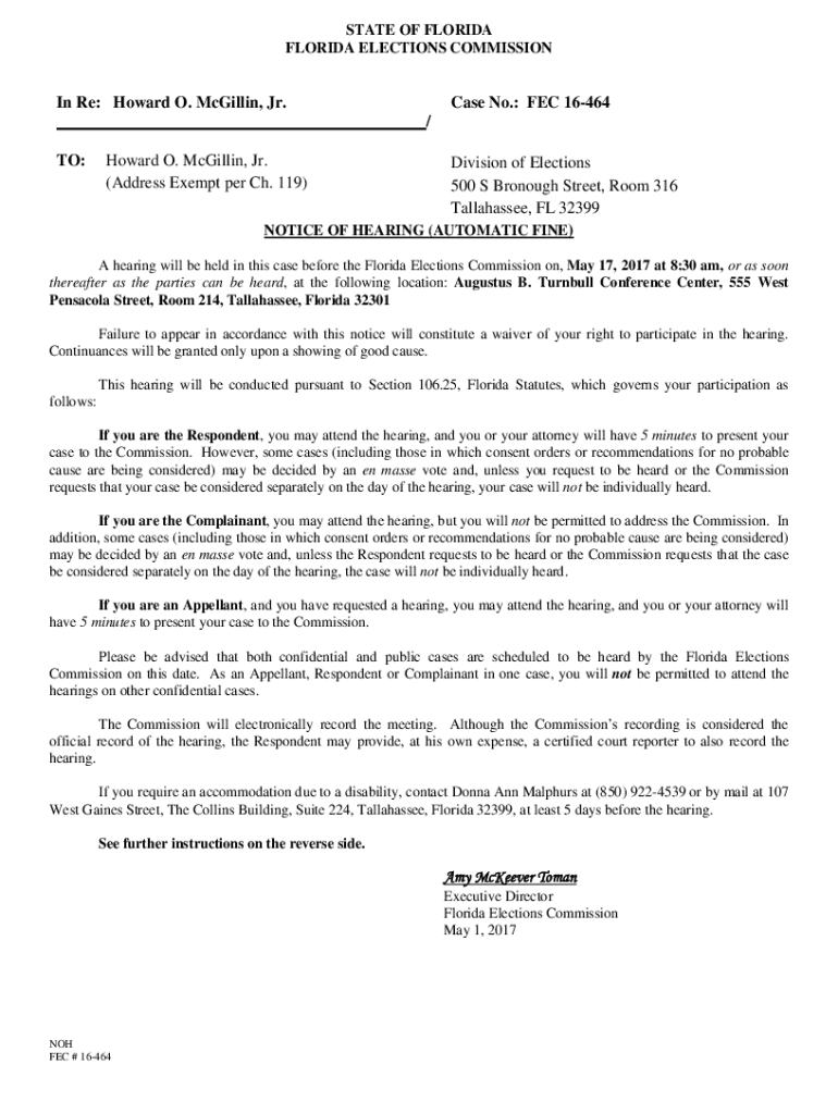 STATE OF FLORIDA ELECTIONS Commissioning Re: Howard O. McMillan, Jr. ___/ TO:Case No.: FEC 16464Howard O. McMillan, Jr. (Address Exempt per Ch. 119)Division of Elections 500 S Borough Street, Room