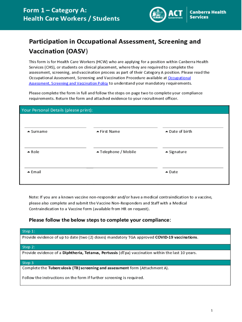 Form 1 Category A: Health Care Workers / Students Participation in Occupational Assessment, Screening and Vaccination (OAS) This form is for Health Care Workers (HOW) who are applying for a position