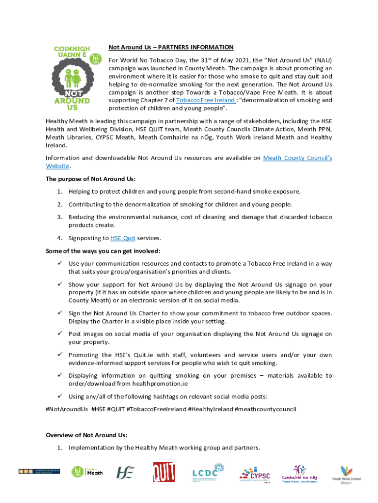 Not Around Us PARTNERS INFORMATION For World No Tobacco Day, the 31st of May 2021, the Not Around Us (NAU) campaign was launched in County Death. The campaign is about promoting an environment where