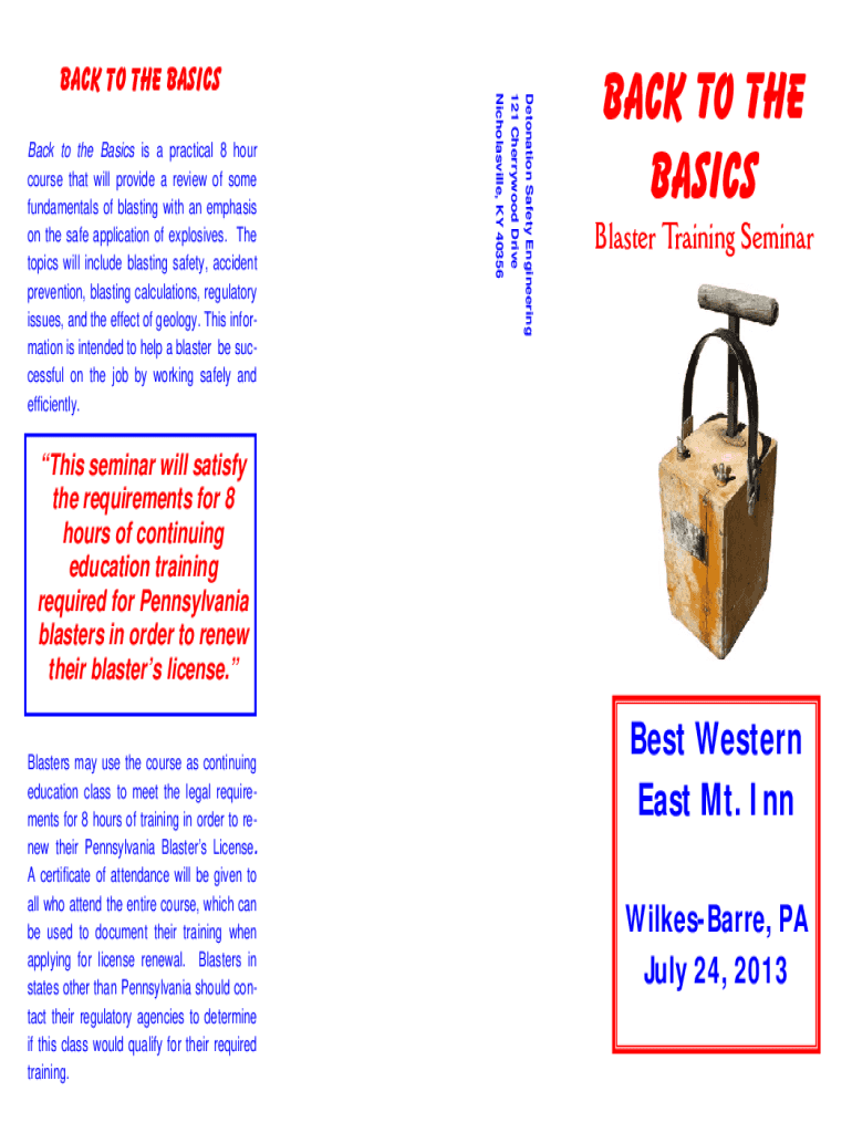 Detonation Safety Engineering121 Cherrywood DriveBack to the Basics is a practical 8 hour course that will provide a review of some fundamentals of blasting with an emphasis on the safe application