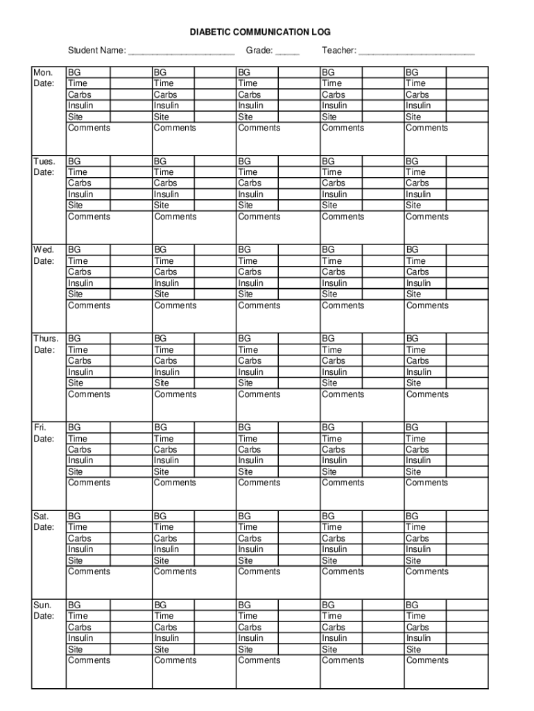 DIABETIC COMMUNICATION LOG Student Name: ___Grade: ___Teacher: ___Mon. Date:BG Time Carbs Site CommentsBG Time Carbs Site CommentsBG Time Carbs Site CommentsBG Time Carbs Site CommentsBG Time Carbs