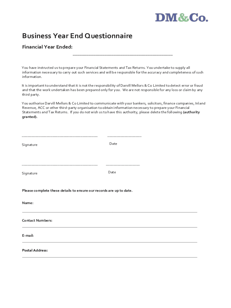 Business Year End Questionnaire Financial Year Ended: ___ You have instructed us to prepare your Financial Statements and Tax Returns. You undertake to supply all information necessary to carry out