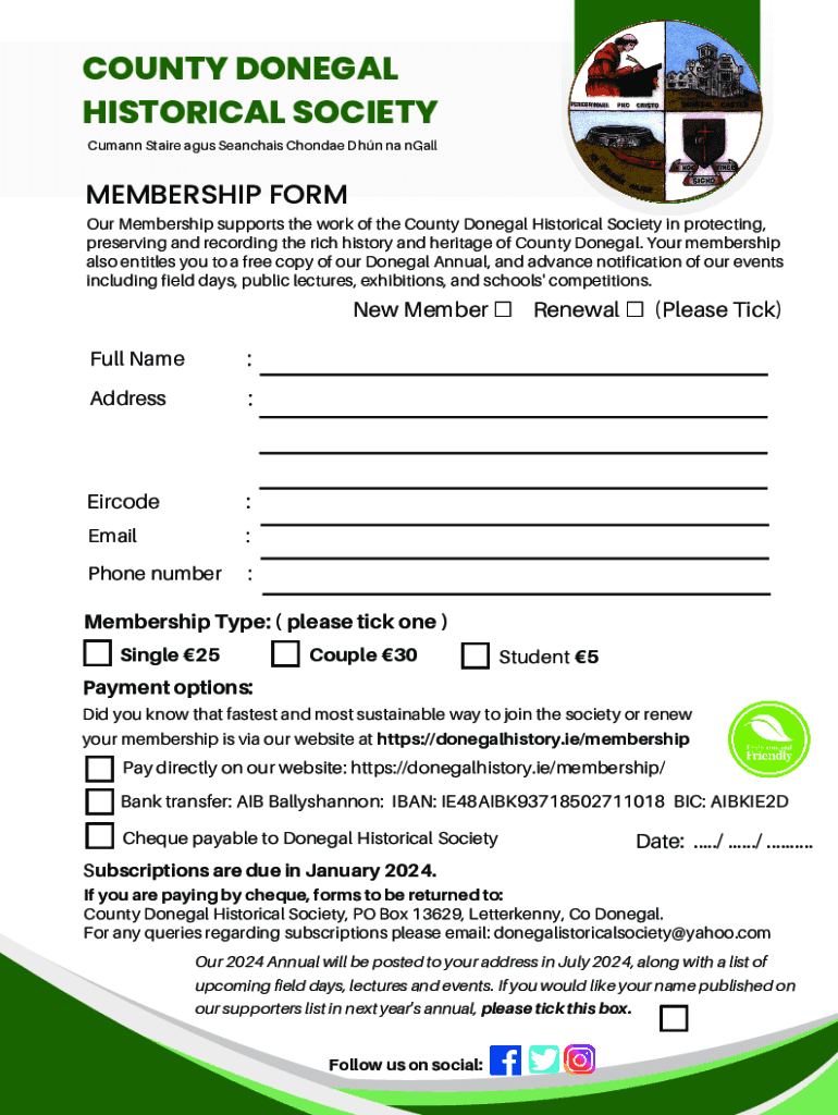COUNTY DONEGAL HISTORICAL SOCIETY Cumann Staire agus Seanchais Chondae Dhn na nGallMEMBERSHIP FORM Our Membership supports the work of the County Donegal Historical Society in protecting, preserving