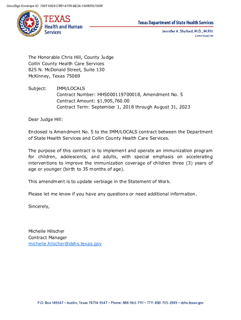 DocuSign Envelope ID: 7AFF55E9C8814709BE3415A80057559FThe Honorable Chris Hill, County Judge Collin County Health Care Services 825 N. McDonald Street, Suite 130 McKinney, Texas 75069 Subject:MM/LOCALS