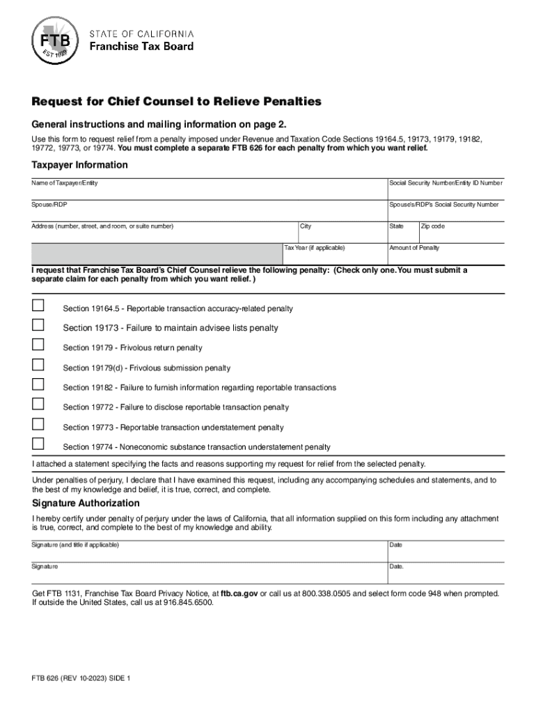 Get the free FTB 626 Request for Chief Counsel to Relieve Penalties. FTB 626, Request for Chief C...