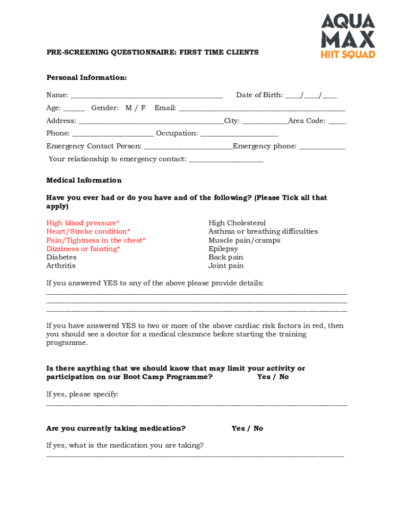 PRESCREENING QUESTIONNAIRE: FIRST TIME CLIENTS Personal Information: Name: ___ Age: ___ Gender: M / FDate of Birth: ___/___/___Email: ___Address: ___City: ___Area Code: ___ Phone: ___ Occupation: