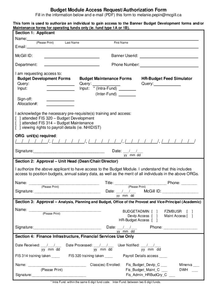 Budget Module Access Request/Authorization Form Fill in the information below and email (PDF) this form to melanie.pepin@mcgill.ca This form is used to authorize an individual to gain access to the