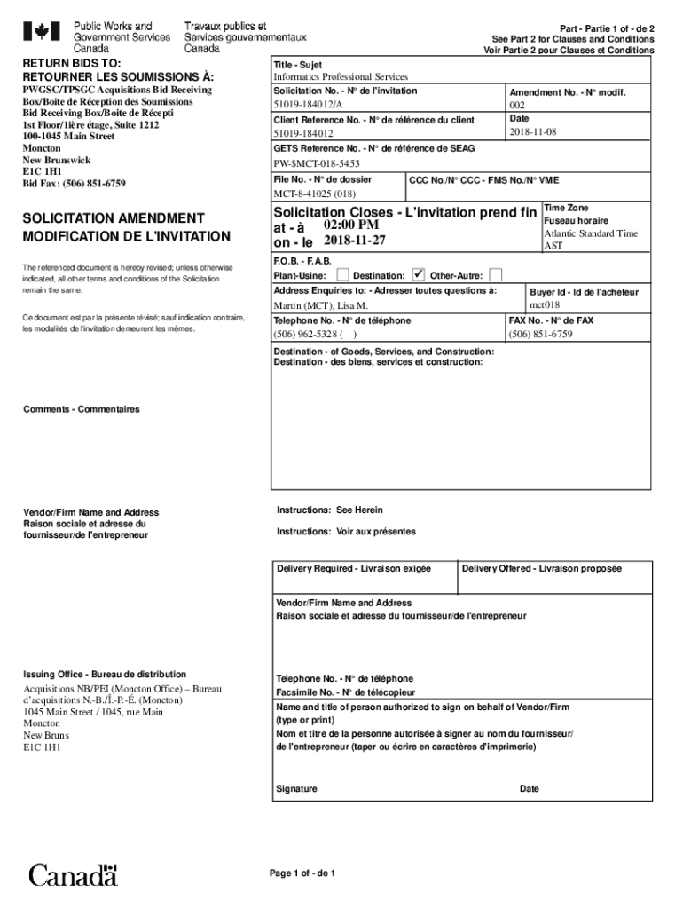 RETURN BIDS TO: RETURNER LES COMMISSIONS : PW GSC/TP SGC Acquisitions Bid Receiving Box/Bite de Rception DES Sou missions Bid Receiving Box/Bite de Rcepti 1st Floor/1ire age, Suite 1212 1001045 Main