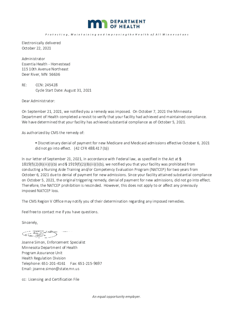 Protecting,MaintainingandImprovingtheHealthofAllMinnesotans Electronicallydelivered October22,2021 Administrator EssentiaHealthHomestead 11510thAvenueNortheast DeerRiver,MN56636 RE: CCN:245428 CycleStartDate:August31,2021DearAdmini
