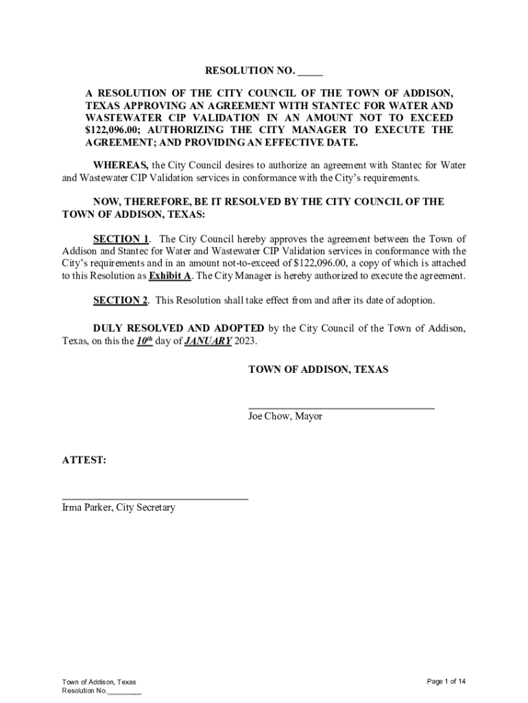 RESOLUTION NO. ___ A RESOLUTION OF THE CITY COUNCIL OF THE TOWN OF ADDISON, TEXAS APPROVING AN AGREEMENT WITH STANTEC FOR WATER AND WASTEWATER CIP VALIDATION IN AN AMOUNT NOT TO EXCEED $122,096.00;