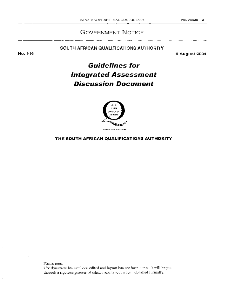 STAATSKOERANT, 6 AUGUSTUS 2004NQ.266293SOUTH AFRICAN QUALIFICATIONS AUTHORITY No. Si166 August 2004Guidelines for integrated Assessment Discussion DocumentPlease note: The document has not been edited