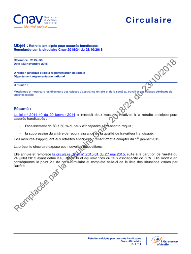 La circulaire aborde les nouvelles dispositions législatives introduites par la loi n° 2014-40 concernant la retraite anticipée pour les assurés handicapés, notamment l\'abaissement du taux d\'incapacité