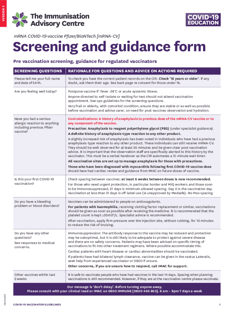 VERSION 5mRNA COVID-19 vaccine Pfizer/BioNTech [mRNA CV]Screening and guidance form
