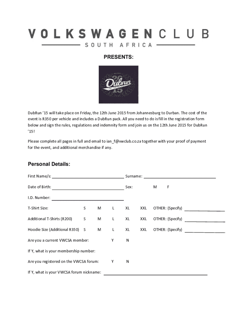 PRESENTS:DubRun 15 will take place on Friday, the 12th June 2015 from Johannesburg to Durban. The cost of the event is R350 per vehicle and includes a DubRun pack. All you need to do is fill in the