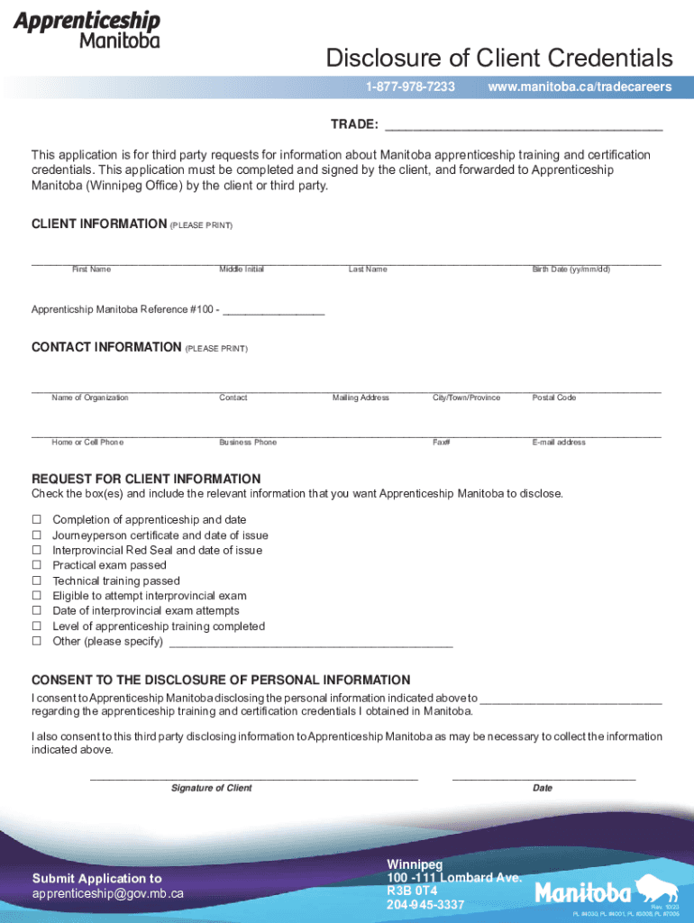 This application is for third party requests for information about Manitoba apprenticeship training and certification