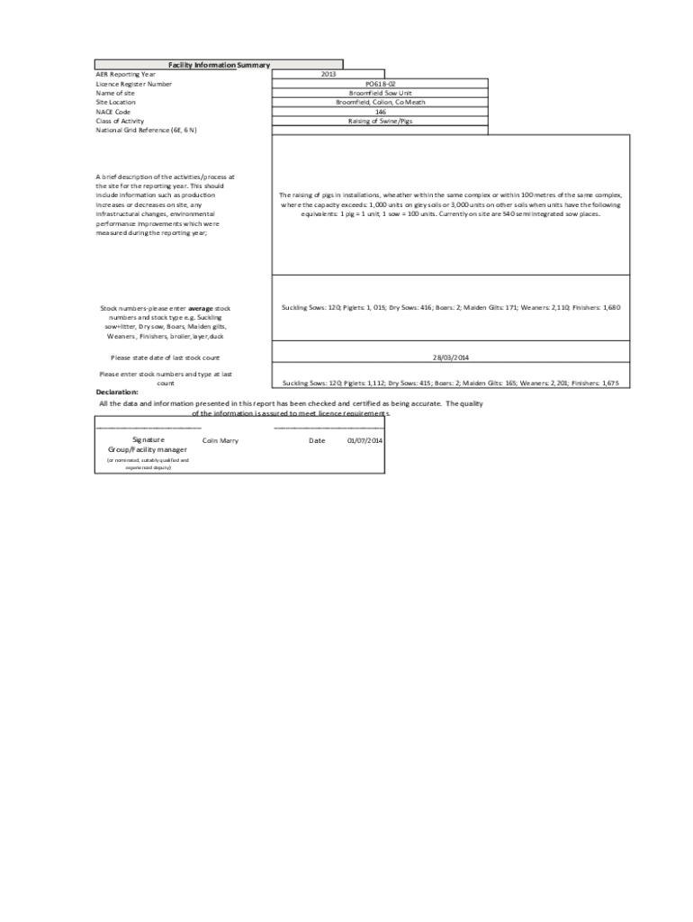Facility Information Summary AER Reporting Year License Register Number Name of site Location NACE Code Class of Activity National Grid Reference (6E, 6 N)2013 PO61802 Broomfield Sow Unit Broomfield,