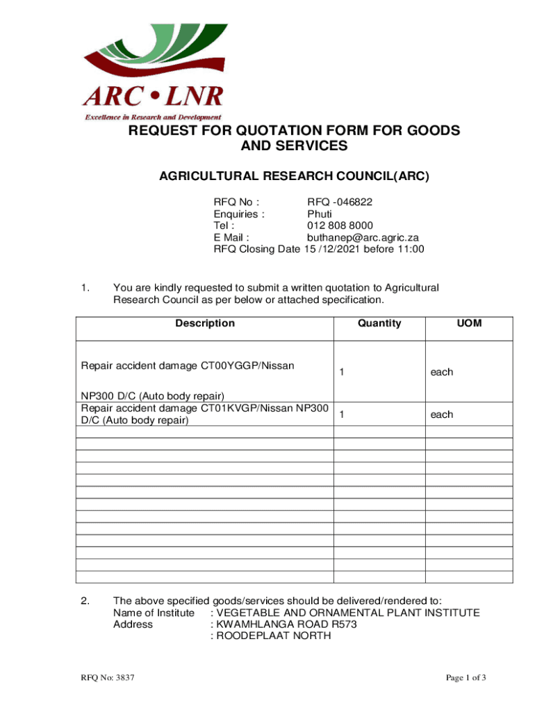 REQUEST FOR QUOTATION FORM FOR GOODS AND SERVICES AGRICULTURAL RESEARCH COUNCIL(ARC) RFQ No : RFQ 046822 Enquiries : Phuti Tel : 012 808 8000 E Mail : buthanep@arc.agric.za RFQ Closing Date 15 /12/2021