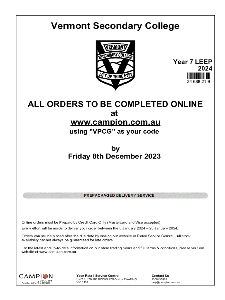 Vermont Secondary CollegeYear 7 LEEP 2024ALL ORDERS TO BE COMPLETED ONLINE at www.campion.com.au using \"VPCG\" as your codeby Friday 8th December 2023Online orders must be Prepaid by Credit Card