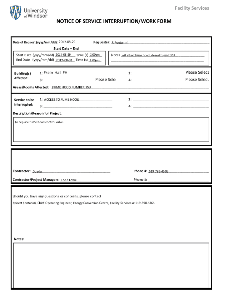 Facility ServicesNOTICE OF SERVICE INTERRUPTION/WORK Format of Request (YYY/mm/dd): 20170829___Requester: ___ R FontaniniStart Date Endgame date Interruption/Closure 20170829 7.00am Start (YYY/mm/dd)