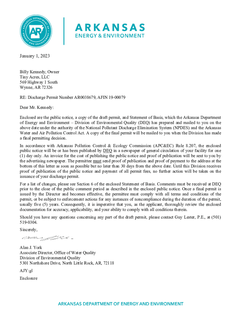 January 1, 2023 Billy Kennedy, Owner Tiny Acres, LLC 569 Highway 1 South Wynne, AR 72326 RE: Discharge Permit Number AR0038679, AFIN 1900079 Dear Mr. Kennedy: Enclosed are the public notice, a copy